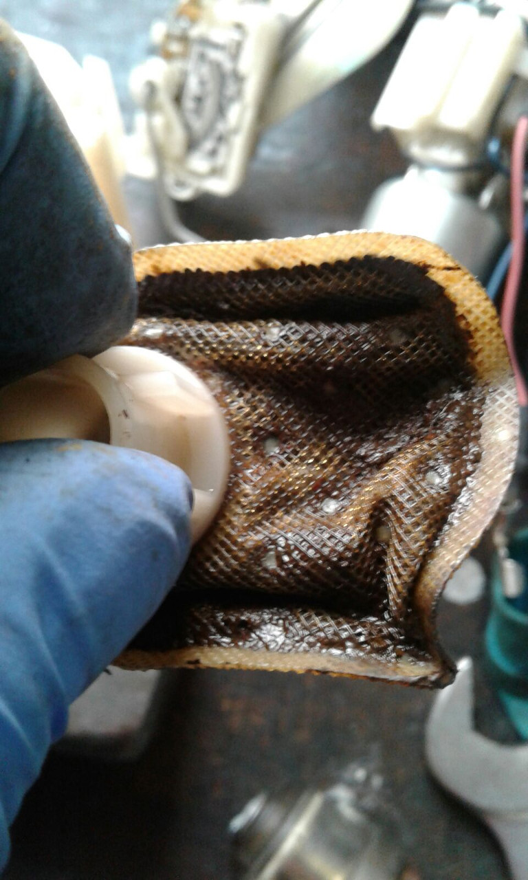 Normálně by to byl asi konec příběhu, ale ten prokletý italský benzín měl v rukávu ještě jedno eso. Protože motorka jezdila, pustil jsem až do konce sezóny celou věc z hlavy. Před letošní sezónou jsem kromě standardní údržby nechal v servisu zkontrolovat i palivovou soustavu. Nevěřil jsem svým očím, když mi potom mechanik ukazoval, co všechno našel v palivovém filtru (viz foto). V servisu všechno vyčistili a zdálo se, že už bude po problémech. Palivové čerpadlo ale bylo jiného názoru. Po menším výletu do Polska letos v dubnu se mi čerpadlo začalo mstít za ten italský benzín a postupně začalo vypovídat službu. Long story short — musel jsem koupit druhé. Oficiálně to tak byl nejdražší benzín, jaký jsem kdy natankoval!