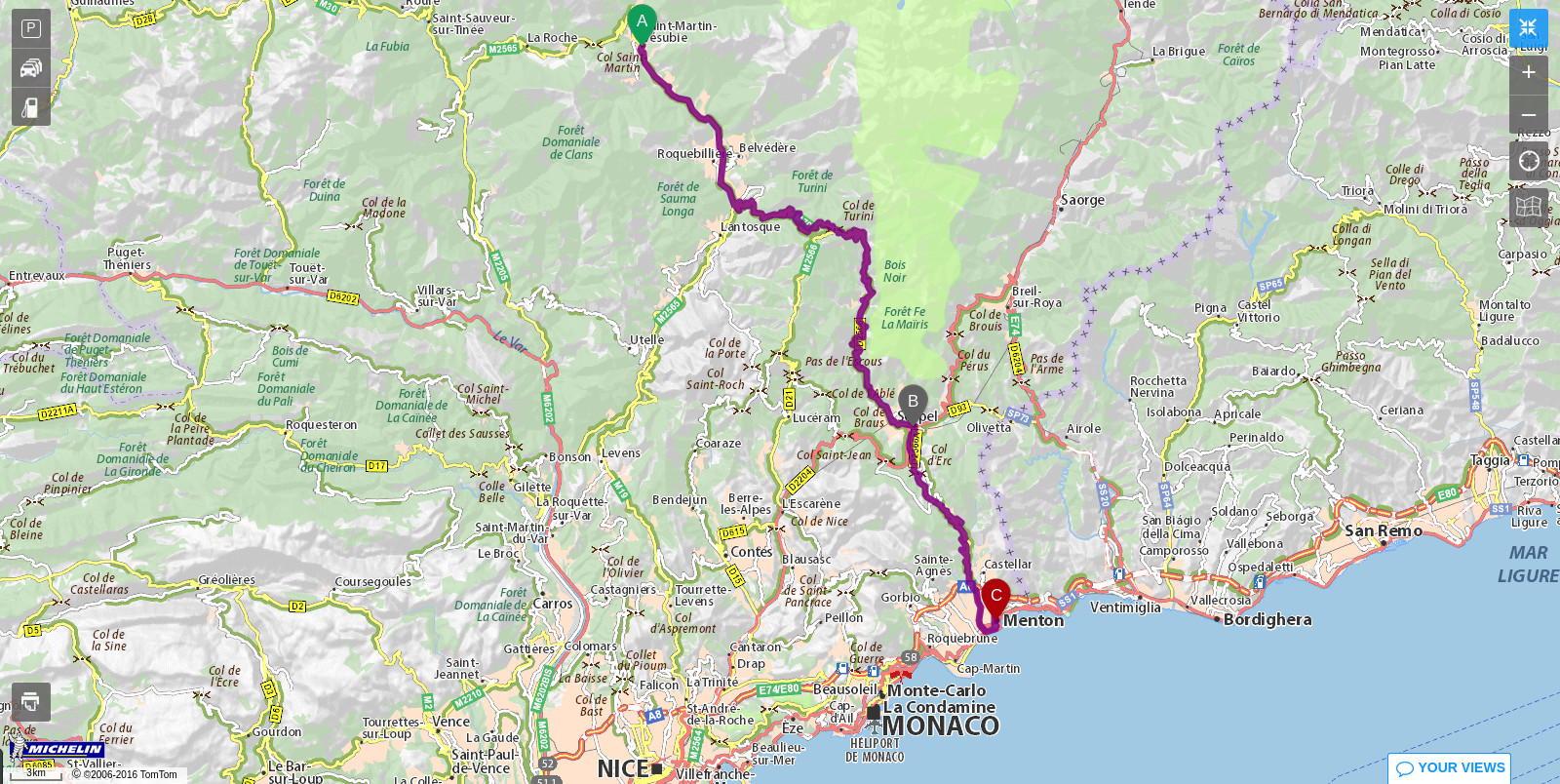 Z Barcelonnette jsem pokračoval skrz průsmyk Col de la Cayolle v národním parku Mercantour do Guillaumes. Tady bohužel končila všechna zábava. Kvalita silnic šla totiž hodně dolů. Celý zbytek cesty až do Saint-Martin-Vésubie jsem byl rád, že jsem nespadnul z motorky. Místňákům to ale evidentně problémy nedělalo. Každých pár minut jsem se pěkně zastyděl, když mě předjížděl nějaký šílenec v Cliu. Pokaždé jsem si říkal: „Motorku přece nebude předjíždět nějaká nákupní taška!“ Zrychlil jsem, ale další zatáčka mě většinou vyškolila dost na to, abych se dobrovolně nechal předjet dalším místním závodníkem.