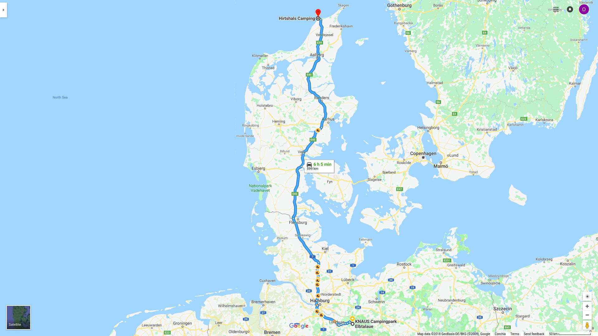 Kousek za hranicemi jsem si udělal na dálnici obědovou přestávku. Kontroloval jsem telefon a objevil jsem zmeškaný hovor. Bylo to britské číslo. Normálně bych na cizí číslo zpátky nevolal, ale vzpomněl jsem si, že mi z Fjordline (tj. společnosti, která provozuje trajekty mezi Hirtshals a Kristiansandem) volali právě z britského čísla, aby mi potvrdili rezervaci. Zkusil jsem teda zavolat nazpět a moje domněnka se potvrdila. Skutečně mi volali z Fjordline. Bohužel proto, aby mi oznámili, že zrušili můj trajekt kvůli špatnému počasí. Naštěstí mi nabídli náhradní trajekt hned druhý den ráno. Samozřejmě si k tomu nezapomněli říct o doplatek, protože to byla dražší linka. Co na tom, že mi můj trajekt před chvílí zrušili. Původně jsem měl v plánu přespat až v Norsku, takže jsem musel ještě zařídit ubytování poblíž přístavu, abych ráno stihnul trajekt. Naštěstí jsem objevil hezký kemp přímo v Hirtshals jen pár desítek metrů od moře a místního majáku. Zbytek cesty do Hirtshals už jsem nikam nespěchal.