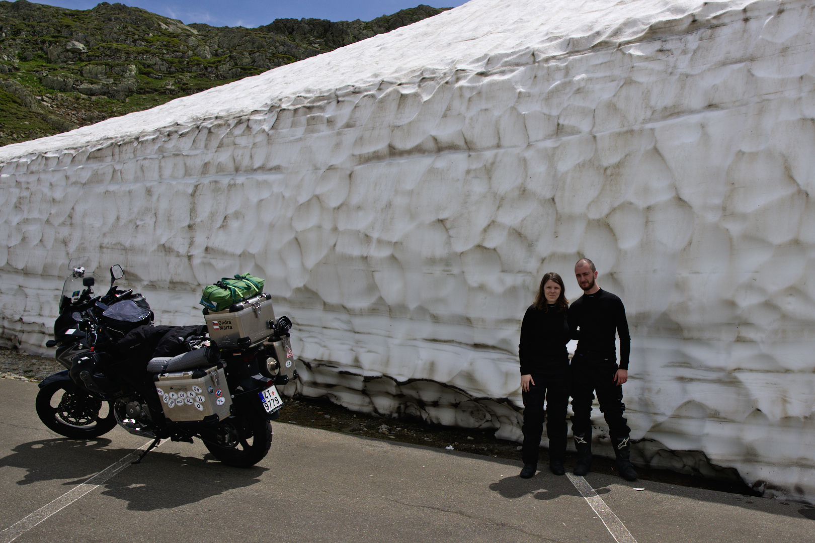 Počasí se na horách mění velice rychle. V Grimselském průsmyku jsme zmokli. V dalším — Furce — už jsme sušili mokré rukavice. Vzduch se po dešti hezky pročistil. Za odměnu jsme se mohli kochat alpskou krajinou a jet po silnici, kde se v roce 1964 proháněl i Sean Connery (a.k.a. James Bond) ve filmu Goldfinger.