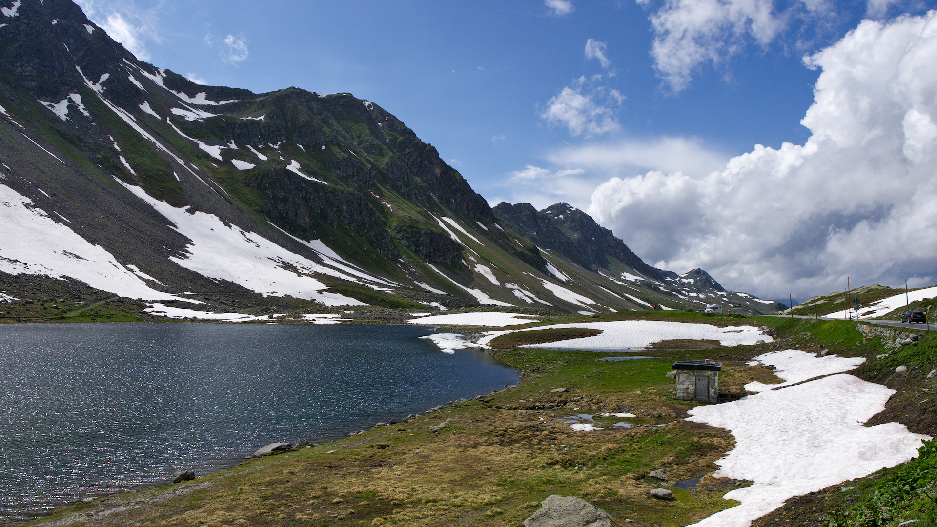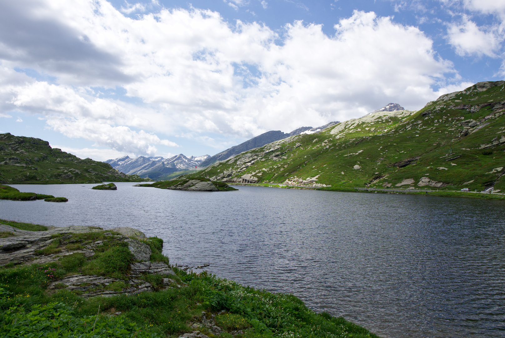 Z Mesocco jsme jeli až na vrchol po silnici číslo 13. Chtěli jsme se vyhnout dálnici, která vede souběžně se zmíněnou silnicí až do městečka San Bernardino. V průsmyku se nachází i malé jezírko s průzračnou vodou.