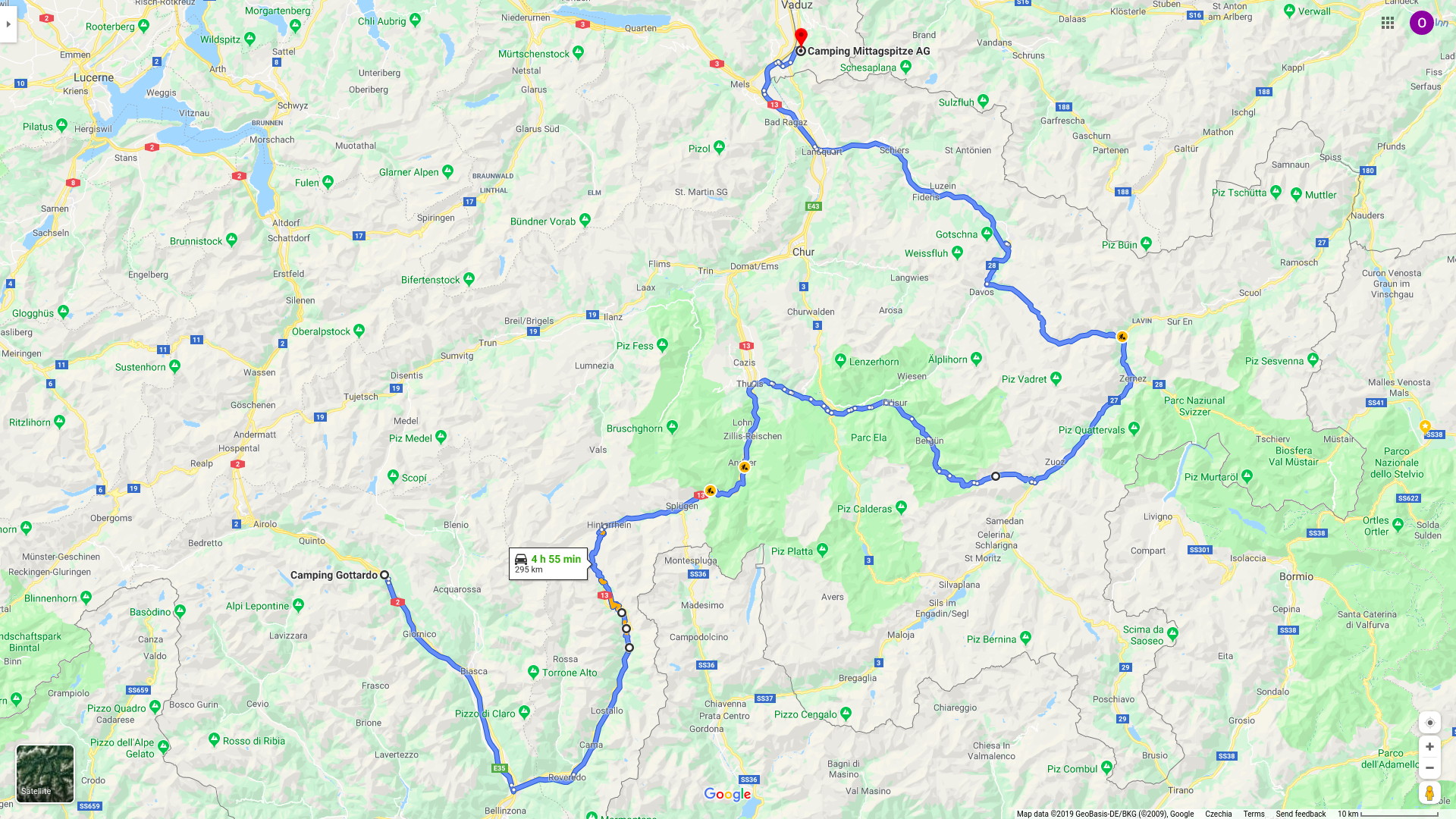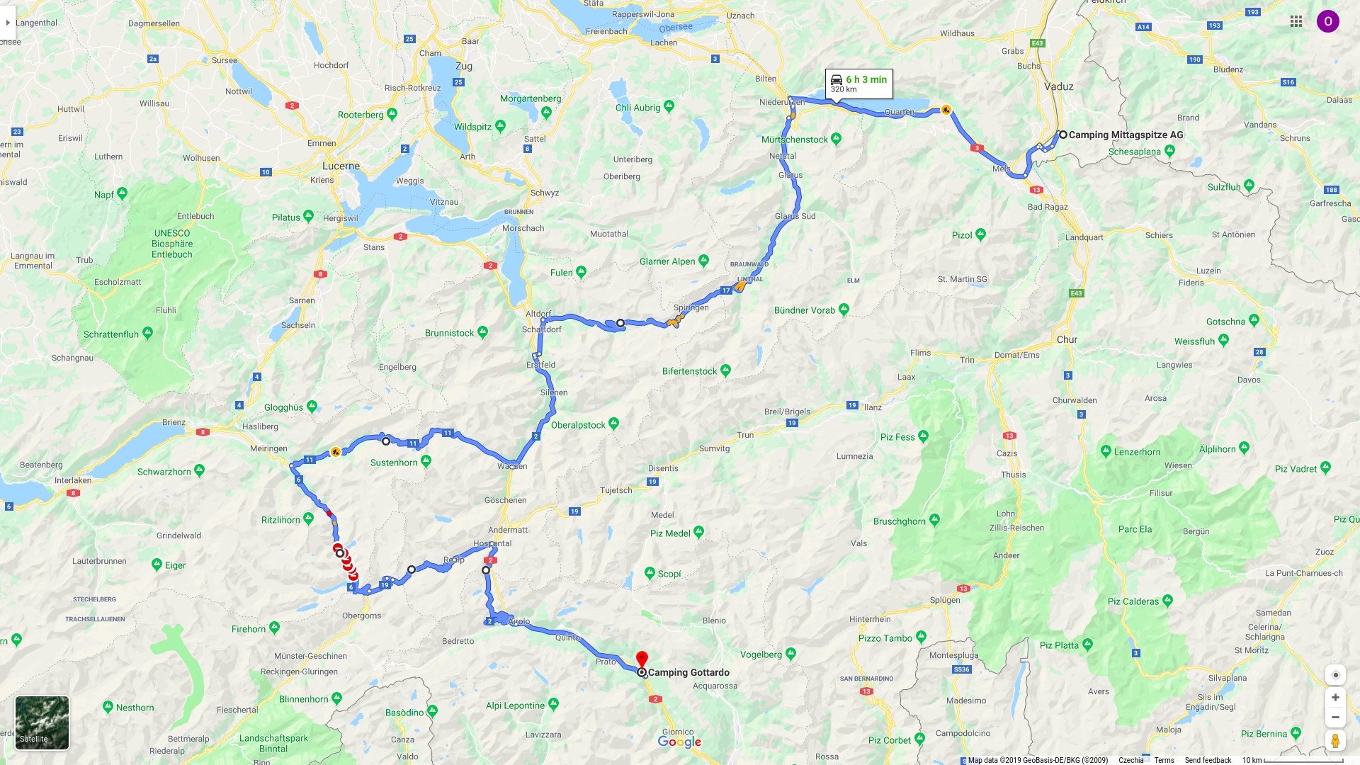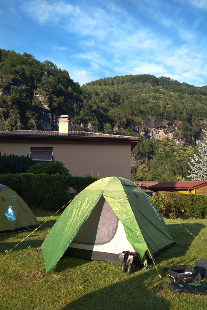 Zvolili jsme nejlevnější možnost, kterou byl nocleh ve stanu. Přespali jsme v kempu Mittagspitze AG v Triesenu v Lichtenštejnsku a v kempu Gottardo v městečku Chiggiogna ve Švýcarsku. V obou kempech jsme platili 32 CHF za noc (cca 800 Kč). Oba místa měly dobrou polohu a byly hezké a udržované. Každý kemp měl také vlastní restauraci a bazén.