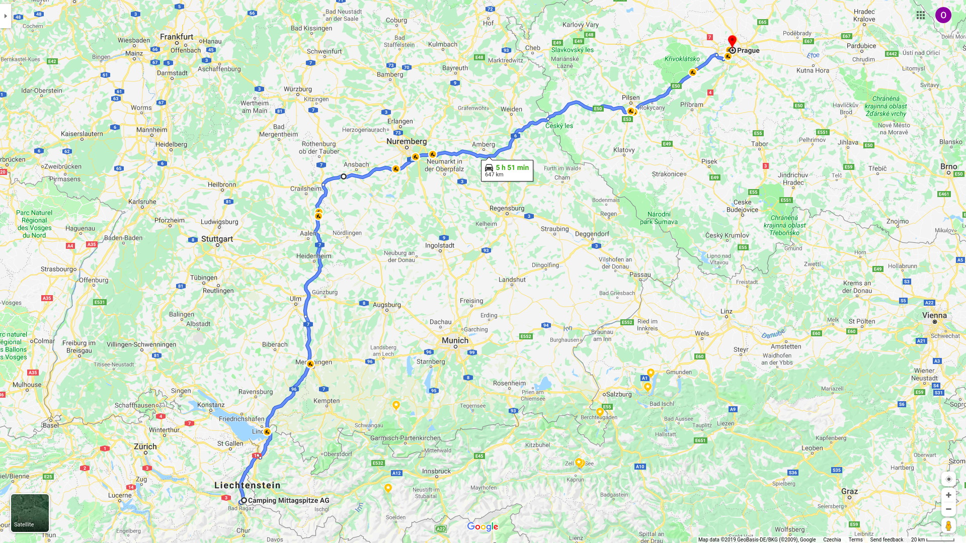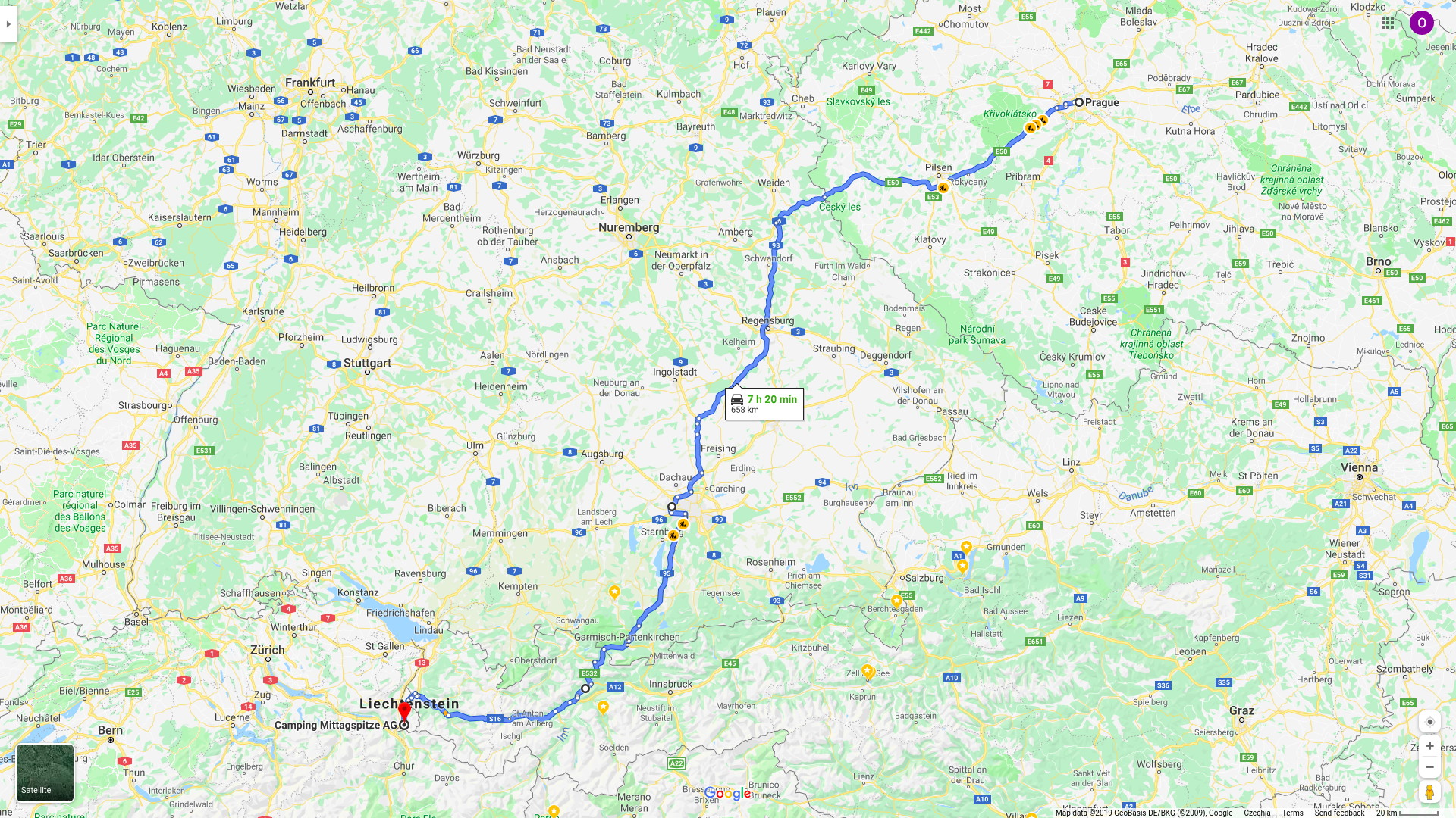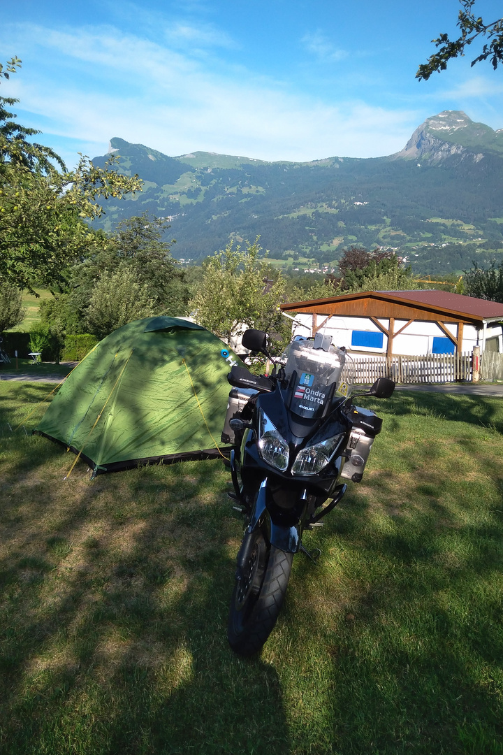 Ráno jsme vyrazili z Prahy do Triesenu, kde jsme plánovali přespat v kempu. Jízda po dálnicích, obzvlášť po těch německých, je pro nás vždycky náročná a nezajímavá. Až u Garmisch-Partenkirchenu jsme se mohli konečně kochat pohledem na Alpy. Najeli jsme 664 kilometrů a strávili jsme 11 hodin na cestě.